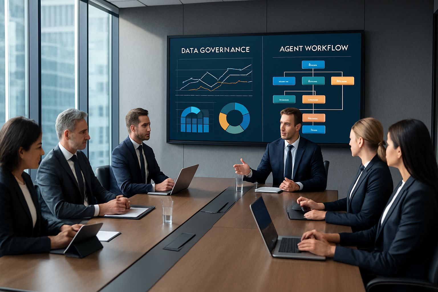 Executives reviewing AI Maturity Frameworks and adoption roadmaps in a digital enterprise boardroom.